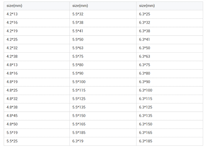 Diameter:8#(4.2mm),10#(4.8mm),12#(5.5mm),14#(6.3mm)